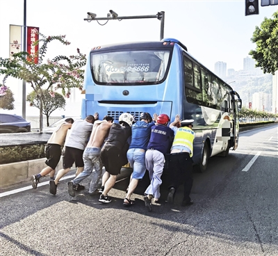 本报讯(记者 唐孝忠)“一二三,推!”7月15日8时许,沙坪坝区石门大桥下沙滨路早高峰的车流中,一声声整齐的号子格外响亮。面对一辆抛锚堵塞交通的十余吨重的旅游大巴,两名执勤民警与6名热心市民组成“人力引擎”,在酷暑高温下用汗水开辟出畅通之路(如图)。