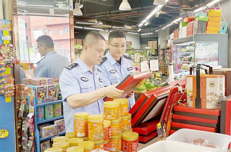 9月26日上午,民警对多家经营场所逐一排查。在超市月饼售卖区,民警仔细核对每款月饼的生产日期、保质期、生产厂家信息,要求经营者出示进货凭证与检测报告,并用手机扫描包装二维码追溯产品来源;同时检查存储条件是否合规,严防“三无”产品、过期食品流入市场。