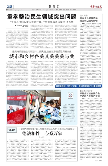 比如,聚焦破解长期以来在污水处理中存在的厂网分离、运行分割、职责分散等难题,谋划实施了“厂网一体”改革,加快构建建管一体、按效付费机制,推动中心城区生活污水集中收集率跃居长江经济带省市前列。聚焦守护城市“生命线”安全,谋划实施了地下管线大综合一体化改革,建成全国首个省级全域全量地下管线数字孪生系统,有效破解了“马路拉链”、管线挖损等难题。聚焦彰显国际风范、山城江城风景、巴渝人文风韵,持续塑造全市域整体大美风貌,全面推进美丽大都市、美丽区县城、美丽小城镇、美丽新乡村建设,努力实现城市和乡村各美其美、美美与共。