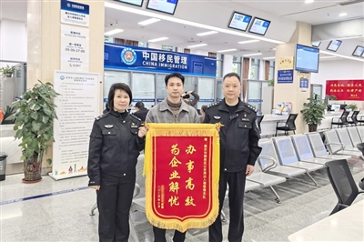 本报讯 铜梁区公安局深化公安“放管服”改革,主动服务、靠前服务,为企解难纾困,持续优化法治化营商环境。近日,该局出入境管理支队为急需出国签订合同的企业负责人周先生高效办理护照,获锦旗致谢。