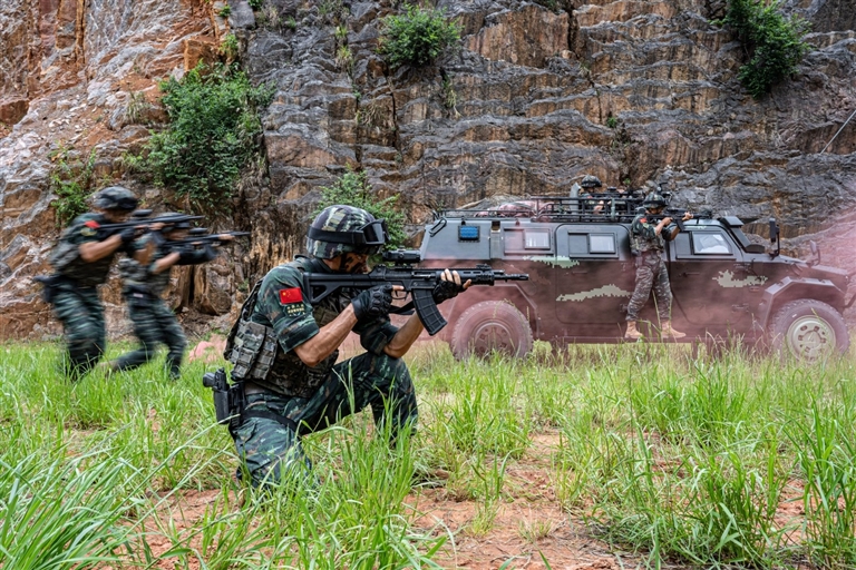 近日,武警重庆总队执勤第五支队特战中队组织官兵开展实战化反恐演练,着力练就特战队员在艰苦环境下的适应能力和复杂条件下的应变能力。图为特战队员向目标快速抵近。