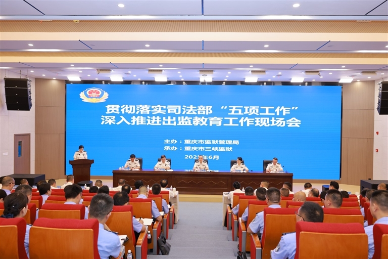 本报讯 6月11日,重庆市监狱系统贯彻落实司法部“五项工作”深入推进出监教育工作现场会在三峡监狱召开(如图)。市监狱局党委书记、局长古明洪出席会议并讲话。市监狱局相关领导、处室负责人,各监狱监狱长及分管教育改造的副监狱长,万州区人力社保局等8个驻地政府部门的相关负责人共100余人参加会议。