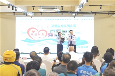 本报讯 6月11日下午,在沙坪坝区新就业群体党群服务中心,市公安局交巡警总队联合相关单位开展“法润巴渝 暖新安全行”交通安全主题宣传活动。活动现场,交巡民警与沙坪坝区委社工部的工作人员一道,通过交通事故情景演绎、交通安全常识自编快板、交通安全公益歌曲等方式,为网约配送员、快递员送上了一场别开生面的的交通安全知识课(如图)。