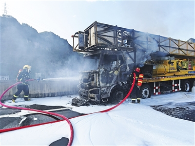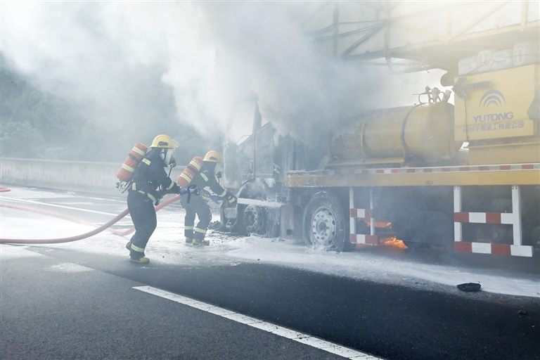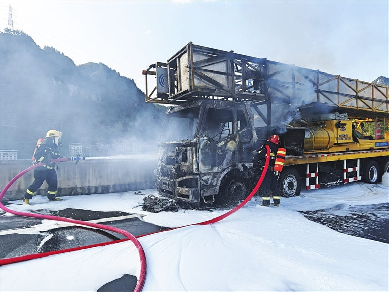 6月16日17时30分许,一辆桥梁检测车在G5515张南高速黔江段行驶途中突然起火。黔江区消防救援支队接警后迅速出动,架设两支水枪从不同角度喷射灭火剂,对车头明火进行集中扑救,同时阻断火势向车身其他部位蔓延。20分钟后,火情被成功扑灭,未造成人员伤亡。