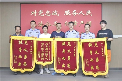 本报讯(记者 李 亚)近日,群众唐某、李某专程来到重庆市公安局送上“见义勇为 挺身而出”“见义勇为扬正气 舍己救人显真情”的锦旗,感谢民警周剑、李戈、杨春雷的救命之恩(如图)。