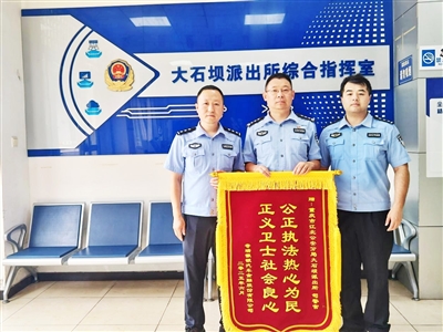 “公正执法热心为民 正义卫士社会良心”这面锦旗是专门送给大石坝派出所民警司同亮和李尨的。车辆使用人小张与金融公司因车辆贷款问题引发纠纷,司同亮和李尨多次组织双方进行平等协商,在调解过程中始终保持公正,耐心地听取双方的诉求,分析问题的症结所在。经过反复劝导和协调,双方终于达成了一致意见,纠纷得到了圆满化解。金融公司和车辆使用人对两位民警的工作都给予了高度评价,金融公司特意邮寄锦旗(如图),向司同亮和李尨表达感谢之情。