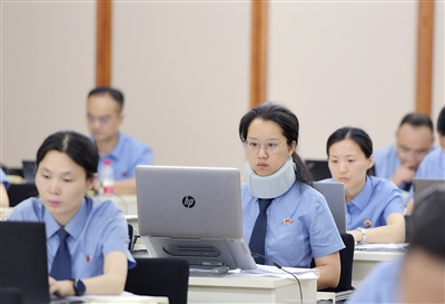 王巽说,这场笔试如同高强度阅卷训练,要求选手在短时间内抽丝剥茧,找出案件适用法律并快速准确定性,考验着公诉人的综合办案能力,也是对选手脑力和体力的双重挑战。由于时间紧迫,很多选手甚至顾不上吃饭。现场还有选手戴着颈椎护具坚持完成笔试。