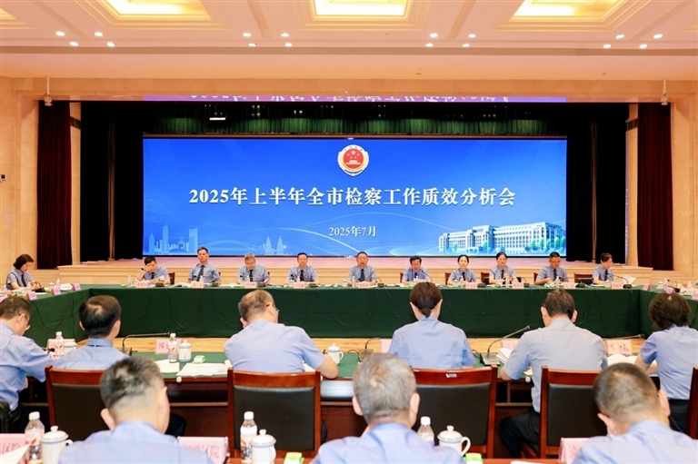 本报讯 7月28日,市检察院召开2025年上半年全市检察工作质效分析会(如图)。会议盘点上半年检察工作成效,分析查找问题,研究谋划下半年工作,进一步坚定信心、乘势而上,奋力实现全年检察工作目标。市检察院党组书记、检察长时侠联出席会议并讲话。