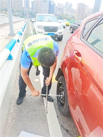 前几天中午,烈日当空,黄花园大桥路面温度近70℃。解放碑大队骁骑队员在执勤时,接到指挥中心调度,发现一辆红色小车打着双闪,停在黄花园大桥中段处,造成交通堵塞,需立即查看处置。“可能是天气太热了,开着开着,右后轮突然爆胎了。”此时,司机正急得围着爆胎转圈,并联系拖车救援。