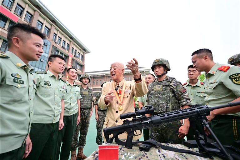 ① 96岁的抗战老兵南玉瑞向官兵了解新式装备的性能用途
