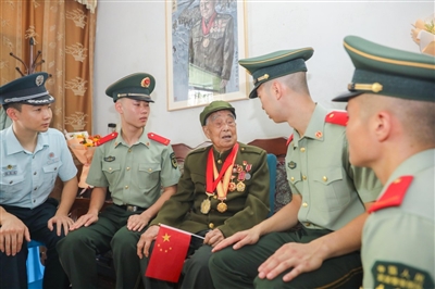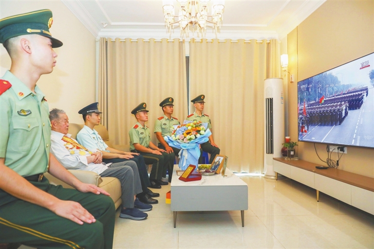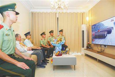 9月3日,武警重庆总队组织官兵认真收看纪念中国人民抗日战争暨世界反法西斯战争胜利80周年大会。武警重庆总队船艇支队特别邀请96岁的抗战老兵南玉瑞走进支队;武警重庆总队执勤第三支队组织官兵上门看望95岁的抗战老兵王锡福和101岁的抗战老兵喻良科,陪同他们观看大会,共同纪念伟大胜利。