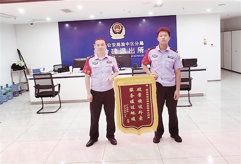 本报讯(记者 李 亚)9月2日,渝中区公安分局解放碑派出所收到一面从广州寄来的特殊锦旗,上面写着“破案快过外卖 服务暖过地暖”,表达了对民警高效办案与温暖服务的真诚谢意(如图),而背后则是一段民警深夜帮外地游客“隔空寻物”的暖心故事。