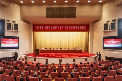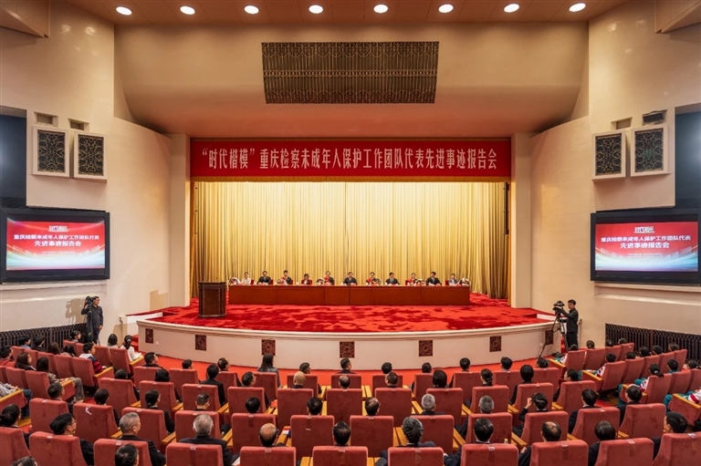 本报讯 11月10日,由中央宣传部、中央政法委、最高人民检察院、重庆市委联合举办的“时代楷模”重庆检察未成年人保护工作团队代表先进事迹报告会在人民大会堂举行(如图)。来自中央和国家有关部门负责同志,政法系统各单位干警、首都大中小学生、部分全国人大代表和全国政协委员、媒体代表等700余人参加报告会。