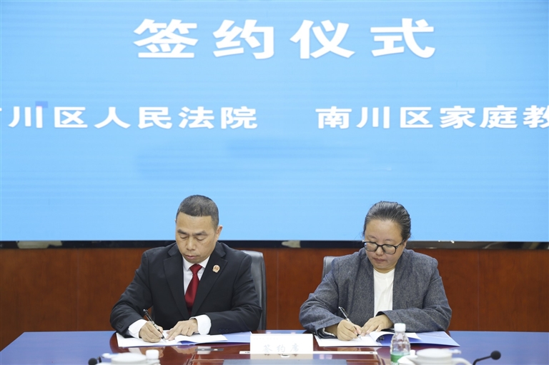 本报讯 近日,南川区法院与南川区家庭教育研究会就涉诉未成年人家庭教育指导签署《家庭教育指导合作协议》(以下简称《协议》,如图),探索“法院+社会组织”联动工作机制,在涉诉未成年人权益保护、家事纠纷化解、社会治理创新等方面形成有效合力。
