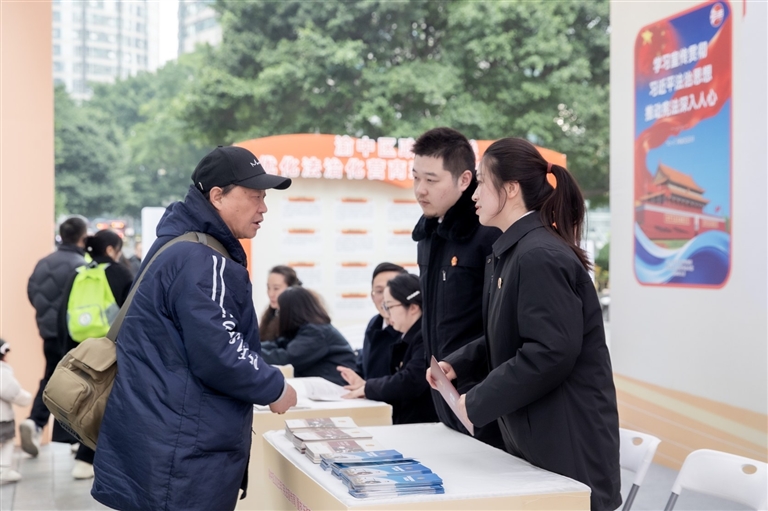 12月4日,潼南区在奋进广场举行“宪法宣传周”集中宣传活动。活动现场上的每一个法治小摊面前都围满了群众,咨询声、解答声、交流声此起彼伏。从消费维权到财产继承,从反诈知识到家庭和睦,工作人员将专业法律条文转化为生动的民生服务,现场为群众解决难题。各单位紧密结合自身职能,将宏大的宪法精神化解为一个个具体的生活答案,实现法治服务与民需民盼的“零距离”对接。