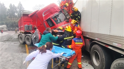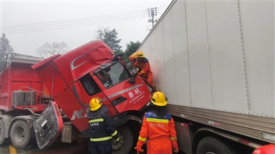 12月19日16时11分,铜梁区319国道少云往小渡方向路段发生两辆挂车相撞事故,造成其中一辆车车头严重变形,驾驶员被卡在驾驶室内,无法动弹。接到报警后,铜梁区安居消防救援站迅速出动3辆消防车赶赴现场。消防救援人员利用液压扩张器扩开车门缝隙,并协力将被困驾驶员小心移出,移交120急救人员。整个过程仅用时8分钟。经检查,驾驶员多处骨折,无生命危险。事故具体原因正在调查中。